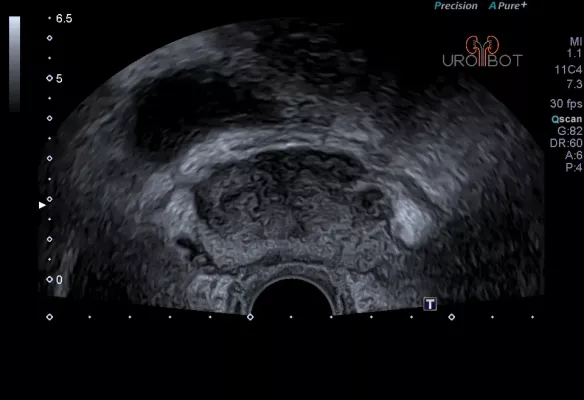 Das Video zeigt eine sonographische Untersuchung der Prostata, durchgeführt über eine sogenannte transrektale Ultraschallsonde.